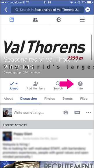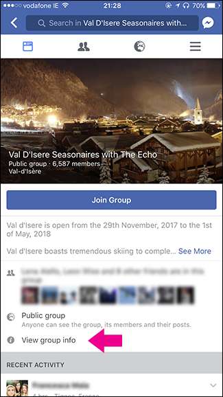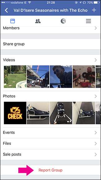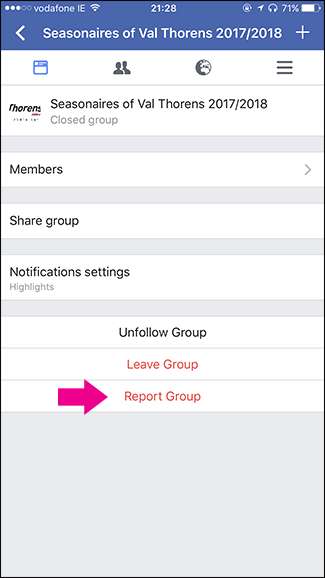 บนอุปกรณ์เคลื่อนที่กระบวนการจะคล้ายกัน เยี่ยมชมกลุ่ม หากคุณเป็นสมาชิกให้แตะข้อมูลจากนั้นรายงานกลุ่ม