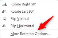 เมนูแบบเลื่อนลงจะปรากฏขึ้นพร้อมกับตัวเลือกสองสามตัวเพื่อหมุนข้อความของคุณ ตัวเลือกสองตัวแรกจะหมุนกล่องข้อความหรือซ้าย 90 องศาจากตำแหน่งปัจจุบัน ตัวเลือกสองตัวถัดไปจะ พลิกกล่องข้อความในแนวตั้งหรือแนวนอน ตามลำดับ หากคุณต้องการป้อนข้อมูลระดับที่แน่นอนให้คลิก "ตัวเลือกการหมุนเพิ่มเติม"