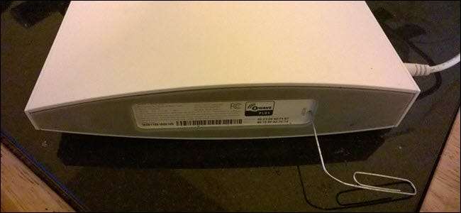 ในการรีเซ็ตให้รับคลิปหนีบกระดาษและคลายงอจากนั้นกดลงในรูรีเซ็ตที่ด้านล่างของฮับจากนั้นถือคลิปหนีบกระดาษไว้ที่นั่น LED ของ Hub ควรเปลี่ยนจาก Solid Green เป็นสีเขียวกะพริบเป็นสีขาวกะพริบ เมื่อคุณเห็นสีขาวกะพริบให้หยุดกดที่ปุ่มรีเซ็ต
