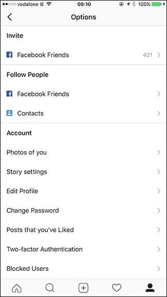 คุณยังสามารถบันทึกรูปภาพที่คุณโพสต์ไปโดยอัตโนมัติ เรื่องราว Instagram ของคุณ . ในหน้า "ตัวเลือก" เดียวกันในหมวด "บัญชี" ให้แตะตัวเลือก "การตั้งค่าเรื่องราว"