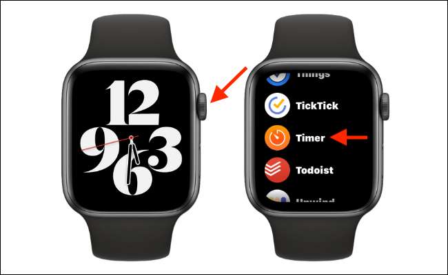 แอปจับเวลาในตัวของ Apple Watch มาพร้อมกับการเข้าถึงการตั้งค่าตัวจับเวลาที่ใช้บ่อยอย่างรวดเร็ว ที่จะใช้พวกเขายก Apple Watch ของคุณแล้วกดมงกุฎดิจิตอล จากนั้นเปิดแอปจับเวลาจากทั้งสองอย่าง มุมมองกริดหรือรายการ บนหน้าจอแอพ