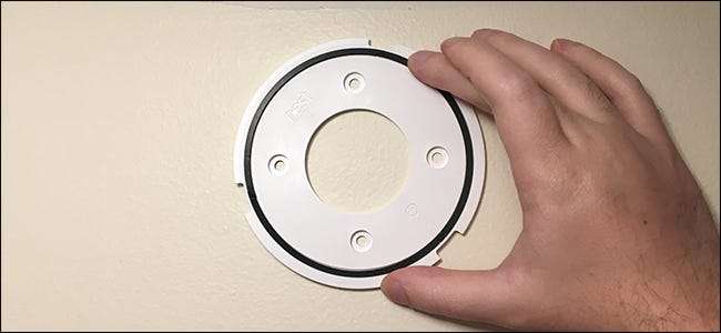 เริ่มต้นด้วยการจับแผ่นยึดและโดยให้แหวนโฟมสีดำหันออกด้านนอกให้ขันแผ่นเข้ากับผนังหรือเพดานโดยใช้สว่านไฟฟ้า หากคุณต้องการให้ Nest Protect หันด้านขวาขึ้นและตรงอย่างสมบูรณ์ตรวจสอบให้แน่ใจว่าโลโก้ Nest บนแผ่นยึดอยู่ที่ด้านซ้ายบนโดยให้รูสกรูเป็นรูปกากบาทตรงขึ้นและตรง (ดังภาพด้านล่าง) คุณอาจต้องเจาะ หลุมนำร่อง อันดับแรกหากคุณกำลังขับรถเข้าไปในสตั๊ด แต่สำหรับ drywall เพียงอย่างเดียวคุณสามารถขับด้วยสกรูได้โดยไม่มีปัญหา
