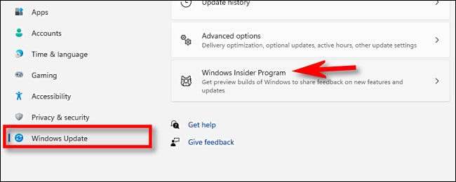 ในการตั้งค่าคลิก "Windows Update" ในแถบด้านข้างแล้วเลือก "Windows Insider Program"