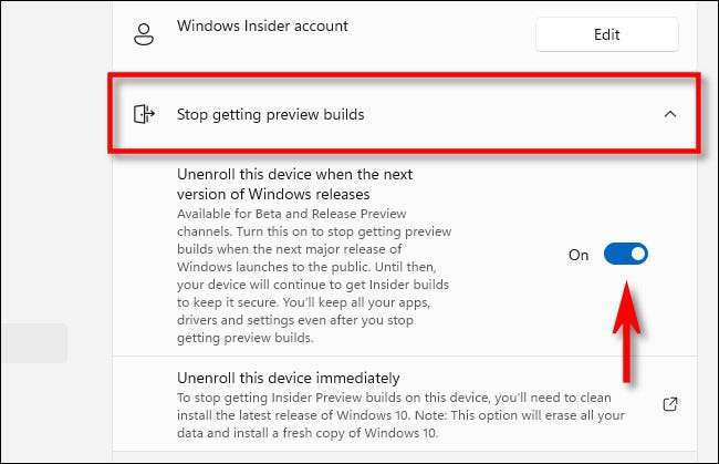 ในการตั้งค่าโปรแกรมของ Windows Insider ให้ขยายส่วน "หยุดการแสดงตัวอย่าง" (โดยคลิกที่มัน) ถัดไปพลิกสวิตช์ข้าง "Unenroll อุปกรณ์นี้เมื่อ Windows รุ่นถัดไปเผยแพร่" เป็น "ต่อไป"