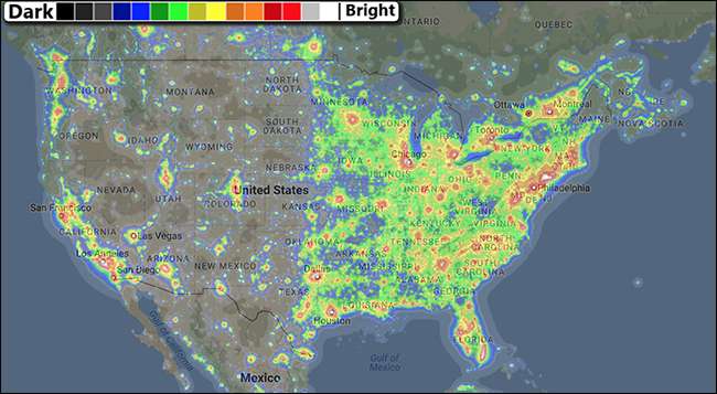 แม้ว่าคุณจะถ่ายภาพท้องฟ้ายามค่ำคืนได้สวยทุกที่ แต่คุณต้องไปที่ไหนสักแห่งที่มืดเพื่อให้ได้ผลลัพธ์ที่ดีที่สุด เมืองที่อยู่ห่างออกไป 30 ไมล์มีมลพิษทางแสงเพียงพอที่จะส่งผลกระทบต่อภาพของคุณ นักถ่ายภาพดาราศาสตร์มืออาชีพมักจะออกไปไกล ๆ ในทะเลทรายหรือขึ้นไปบนภูเขาเพื่อถ่ายภาพ วิธีที่ดีที่สุดในการค้นหาท้องฟ้าที่มืดมิดก็คือ แผนที่มลพิษทางแสงของ Dark Site Finder . คุณสามารถดูในภาพหน้าจอด้านล่างว่าครึ่งตะวันออกส่วนใหญ่ของสหรัฐฯค่อนข้างแย่สำหรับการถ่ายภาพใกล้ ๆ แต่ทางตะวันตกและมิดเวสต์มีตัวเลือกมากมาย