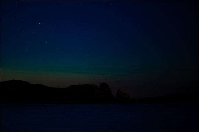 หากคุณไม่สามารถอยู่ในที่มืดได้สิ่งที่ควรทำคือถ่ายภาพเส้นขอบฟ้าที่มืดที่สุด ฉันอาศัยอยู่ในบริเวณที่มีแสงค่อนข้างปนเปื้อน แต่เนื่องจากอยู่บนชายฝั่งฉันจึงสามารถถ่ายภาพตอนกลางคืนได้เช่นเดียวกับภาพด้านล่างที่แสดงแสงออโรร่าโบเรียลิสตราบเท่าที่ฉันเล็งกล้องไปที่ทะเล