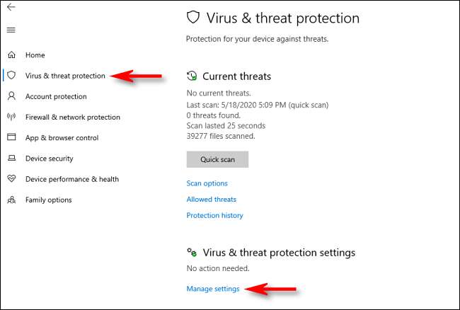 ใน Windows Security ให้คลิก“ Virus & Threat Protection” ในแถบด้านข้าง จากนั้นเลือก“ จัดการการตั้งค่า”