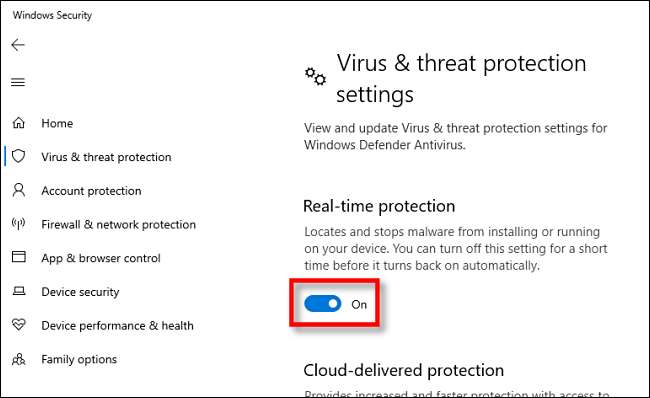 ใน“ การตั้งค่าการป้องกันไวรัสและภัยคุกคาม” ให้ค้นหาตัวเลือก“ การป้องกันแบบเรียลไทม์” และคลิกสวิตช์ที่ระบุว่า“ เปิด” เพื่อสลับไปที่ตำแหน่ง“ ปิด”