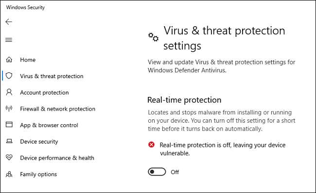 ปิดการป้องกันแบบเรียลไทม์แล้ว Windows Security จะแสดงข้อความที่ดูน่ากลัวเหนือสวิตช์ซึ่งบอกว่าอุปกรณ์ของคุณมีช่องโหว่แล้ว Windows จะเปิดการป้องกันแบบเรียลไทม์โดยอัตโนมัติหลังจากช่วงเวลาสั้น ๆ