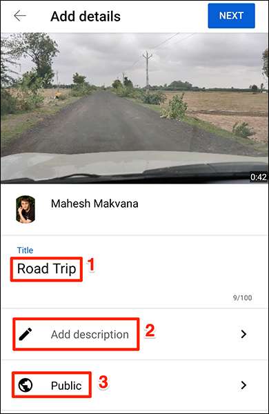 ตอนนี้คุณอยู่ในหน้าจอ "เพิ่มรายละเอียด" ที่นี่แตะฟิลด์ "ชื่อเรื่อง" แล้วป้อนชื่อวิดีโอของคุณ แตะ "เพิ่มคำอธิบาย" และเพิ่มคำอธิบายในวิดีโอของคุณ