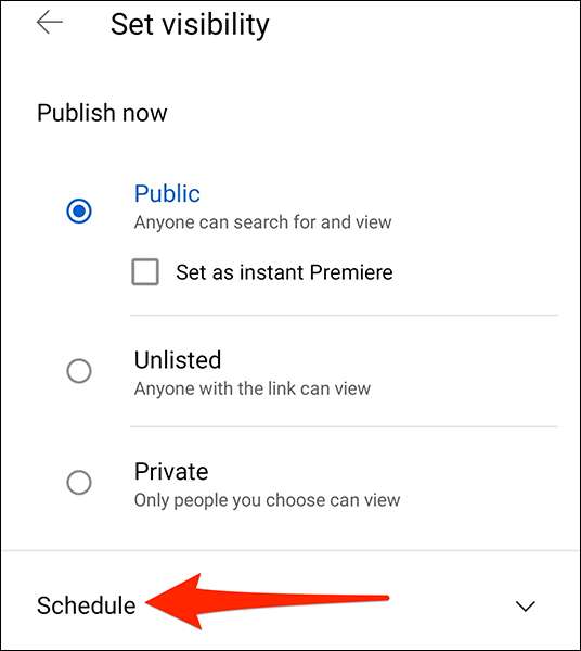 หากคุณต้องการที่จะปล่อยวิดีโอของคุณบน YouTube ในเวลาที่กำหนด จากนั้นในหน้าจอ "Set Visibility" เดียวกันให้แตะตัวเลือก "กำหนดการ"