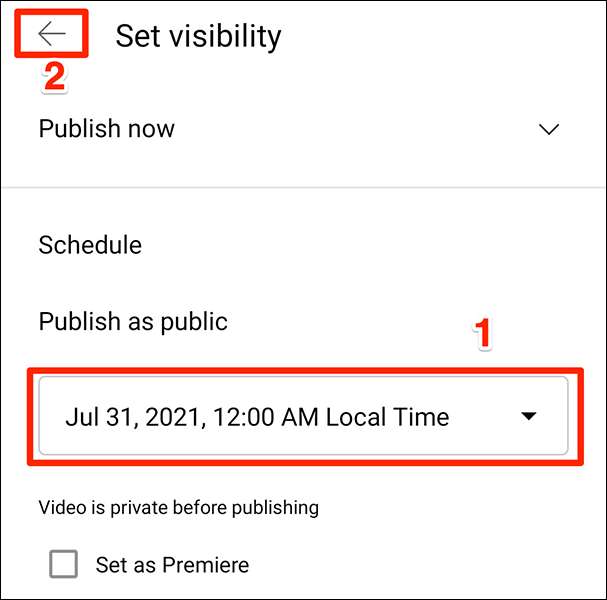 แตะกล่องดรอปดาวน์วันที่และเวลาแล้วเลือกวันที่และเวลาสำหรับการเปิดตัววิดีโอของคุณ เมื่อทำเสร็จแล้วให้แตะไอคอนลูกศรด้านหลังที่มุมบนซ้ายของแอพ