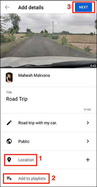 กลับไปที่หน้าจอ "เพิ่มรายละเอียด" แตะ "ตำแหน่ง" และเพิ่มตำแหน่งในวิดีโอของคุณ ถ้าคุณต้องการ เพิ่มวิดีโอของคุณในเพลย์ลิสต์ แตะตัวเลือก "เพิ่มในเพลย์ลิสต์"