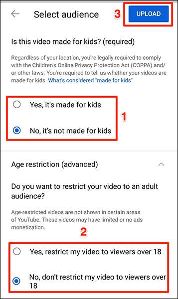 หากคุณเลือก "ไม่มันไม่ได้สร้างขึ้นสำหรับเด็ก ๆ " ระบุตัวเลือกเพิ่มเติมโดยการแตะ "อายุการ จำกัด (ขั้นสูง)" จากนั้นที่มุมบนขวาของแอพแตะ "อัปโหลด"