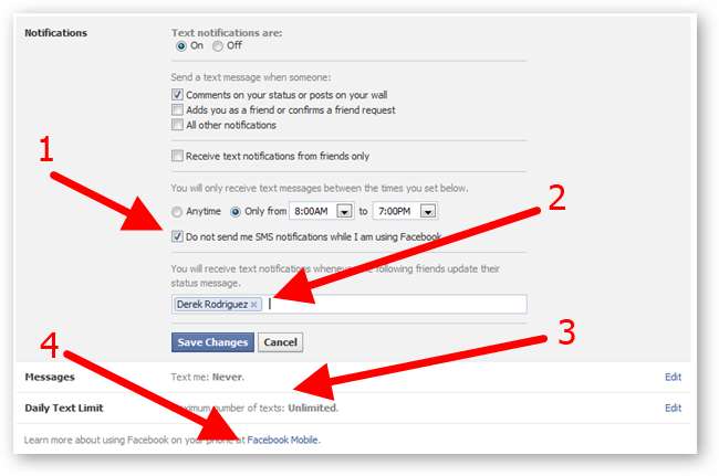 ในภาพหน้าจอด้านล่างเราขอแนะนำให้ทำเครื่องหมายในช่องตามหมายเลข 1 เพิ่มเพื่อนที่คุณต้องการรับการแจ้งเตือนจากหมายเลข 2 และตั้งค่าสำหรับข้อความโต้ตอบแบบทันทีของ Facebook และขีด จำกัด รายวันถัดจากหมายเลข 3