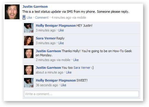 หากต้องการส่งการอัปเดตเพียงแค่ส่งข้อความ SMS ใหม่ไปที่ 32665 พร้อมสถานะของคุณในเนื้อหาข้อความ อัปโหลดรูปถ่ายและวิดีโอโดยส่งผ่าน MMS ไปยังที่อยู่อีเมลที่ให้ไว้ คุณยังสามารถตอบกลับการอัปเดตของใครบางคนได้โดยตอบกลับข้อความ SMS ที่ส่งถึงคุณ