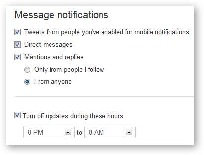 Twitter ทำงานในลักษณะเดียวกันกับการตั้งค่า เข้าสู่ระบบและไปที่การตั้งค่า -> มือถือ เพิ่มหมายเลขของคุณและเปลี่ยนการตั้งค่าที่คุณต้องการด้านล่าง