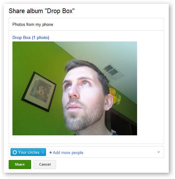 เมื่อคุณส่งรูปภาพทางอีเมลรูปภาพจะถูกเพิ่มลงในอัลบั้มดรอปบ็อกซ์ใน Picasa โดยอัตโนมัติ โดยค่าเริ่มต้นจะไม่แชร์อัลบั้มนี้กับใคร แต่คุณสามารถเปลี่ยนการเปิดเผยได้อย่างง่ายดายจากใน Google+