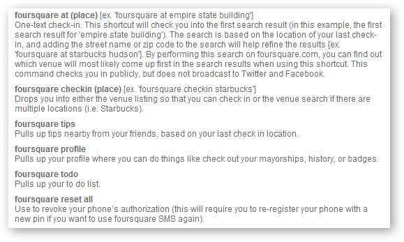คำสั่งพื้นฐานที่คุณอาจใช้คือ“ foursquare at สถานที่ [zip code]” คำสั่ง“ foursquare at” จะตรวจสอบคุณในผลการค้นหาแรกสำหรับสถานที่ที่คุณระบุ หากคุณไม่แน่ใจชื่อสถานที่คุณสามารถใช้ "เช็คอิน foursquare วาง [zip code]” และคุณจะได้รับข้อความกลับพร้อมรายชื่อสถานที่ที่ตรงกับการค้นหาของคุณ จากนั้นคุณสามารถตรวจสอบผลลัพธ์ที่ส่งกลับรายการใดรายการหนึ่งได้โดยตอบกลับข้อความพร้อมระบุหมายเลขผลลัพธ์
