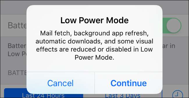 เมื่อ iPhone ของคุณเหลือพลังงานแบตเตอรี่ถึง 20 เปอร์เซ็นต์คุณจะเห็นข้อความแจ้ง“ โหมดพลังงานต่ำ” ปรากฏขึ้น iPhone ของคุณจะแจ้งให้คุณทราบว่าคุณลักษณะใดบ้างที่จะถูกปิดใช้งานชั่วคราวและคุณสามารถเลือกที่จะ“ ดำเนินการต่อ” และเปิดใช้งานโหมดพลังงานต่ำหรือ“ ยกเลิก” และไม่เปิดใช้งานโหมดพลังงานต่ำ มีรายงานว่าโหมดพลังงานต่ำสามารถให้คุณมีเวลาเพิ่มขึ้นตั้งแต่หนึ่งถึงสามชั่วโมงก่อนที่ iPhone ของคุณจะตาย ขึ้นอยู่กับว่าคุณกำลังทำอะไรกับ iPhone ของคุณจริงๆ