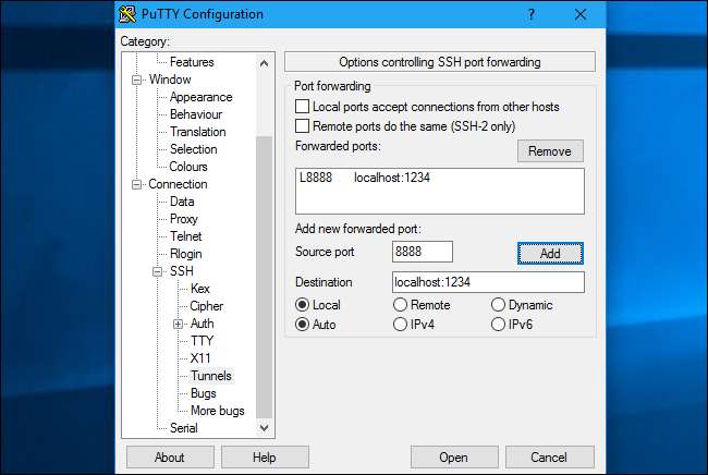 ในการดำเนินการนี้ในแอปพลิเคชัน PuTTY บน Windows ให้เลือกการเชื่อมต่อ> SSH> อุโมงค์ เลือกตัวเลือก“ ท้องถิ่น” สำหรับ "พอร์ตต้นทาง" ให้ป้อนพอร์ตภายในเครื่อง สำหรับ“ ปลายทาง” ให้ป้อนที่อยู่ปลายทางและพอร์ตในรูปแบบ remote_address: remote_port