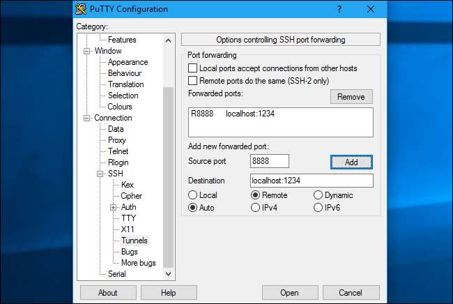 หากต้องการทำสิ่งนี้ใน PuTTY บน Windows ให้เลือกการเชื่อมต่อ> SSH> อุโมงค์ เลือกตัวเลือก“ รีโมท” สำหรับ“ พอร์ตต้นทาง” ให้ป้อนพอร์ตระยะไกล สำหรับ "Destination" ให้ป้อนที่อยู่ปลายทางและพอร์ตในรูปแบบ local_address: local_port