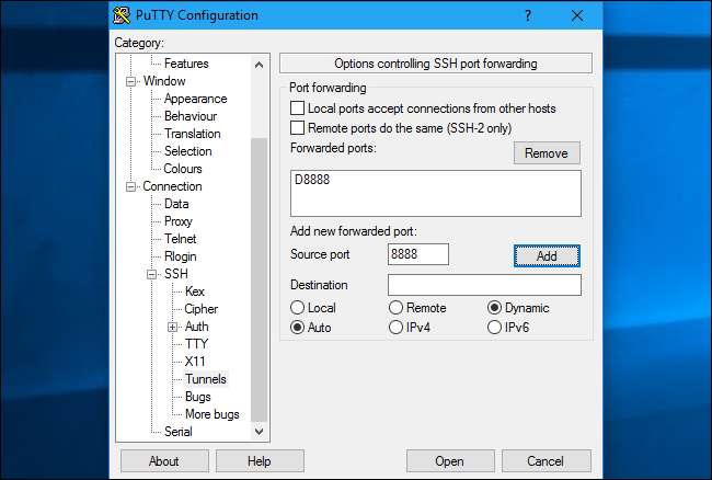 หากต้องการทำสิ่งนี้ใน PuTTY บน Windows ให้เลือกการเชื่อมต่อ> SSH> อุโมงค์ เลือกตัวเลือก“ ไดนามิก” สำหรับ "พอร์ตต้นทาง" ให้ป้อนพอร์ตภายในเครื่อง