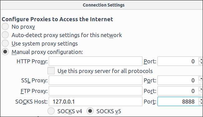 เมื่อทำสิ่งนี้ใน Firefox ให้เลือก“ การกำหนดค่าพร็อกซีด้วยตนเอง” ป้อน“ 127.0.0.1” ลงในกล่องโฮสต์ SOCKS และป้อนพอร์ตไดนามิกลงในช่อง“ พอร์ต” เว้นช่อง HTTP Proxy, SSL Proxy และ FTP Proxy ว่างไว้