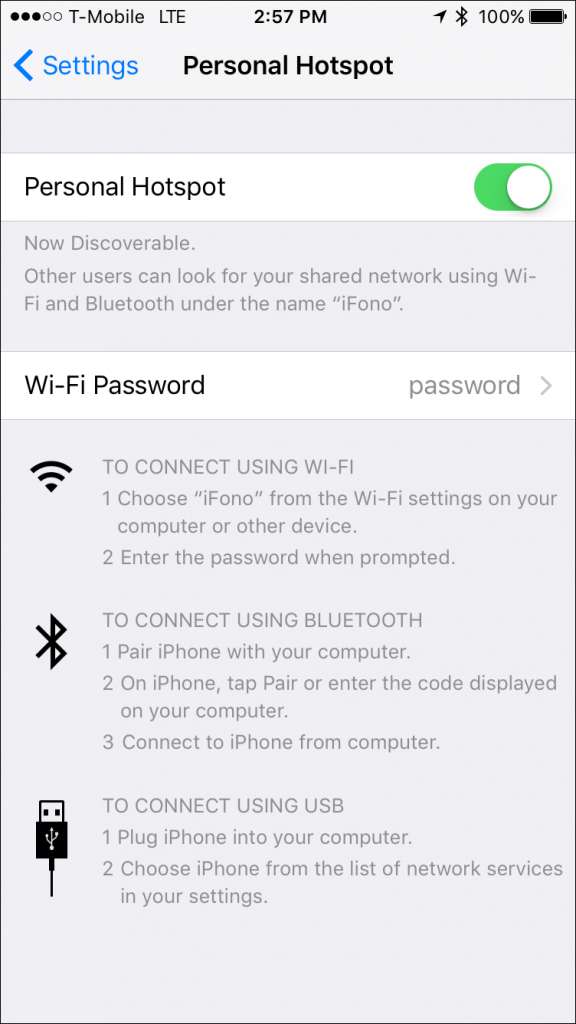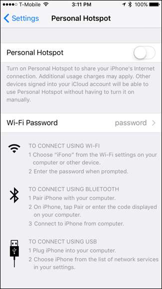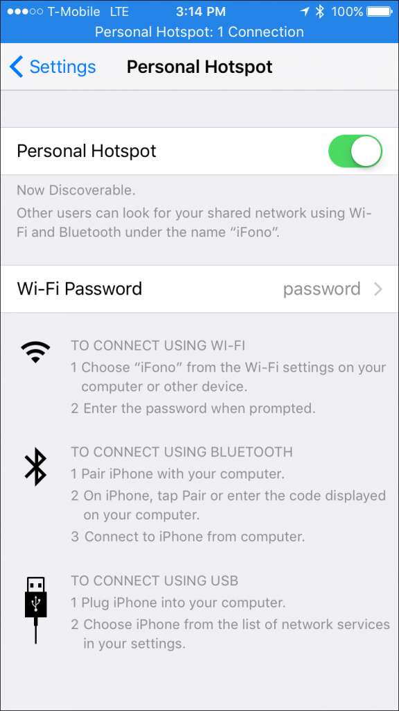 มีสามวิธีในการเชื่อมต่อกับ iPhone ของคุณและใช้การเชื่อมต่อข้อมูล: Wi-Fi บลูทู ธ และ USB เมื่อคุณเปิด Personal Hotspot จะช่วยให้คุณสามารถใช้ตัวเลือกใดก็ได้จากสามตัวเลือกนี้คุณไม่จำเป็นต้องแก้ไขการตั้งค่าใด ๆ