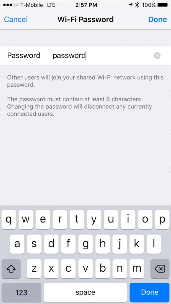 ก่อนที่คุณจะทำสิ่งอื่นใดคุณสามารถ (และควร) แตะ“ รหัสผ่าน Wi-Fi” เพื่อเปลี่ยนรหัสผ่านของฮอตสปอตของคุณ หากไม่มีรหัสผ่านที่คาดเดายากใครก็ตามที่อยู่ในระยะสามารถเชื่อมต่อกับโทรศัพท์ของคุณได้ ดังนั้นคุณควรเพิ่มรหัสผ่านที่รัดกุมที่นี่แม้ว่าคุณจะไม่ได้วางแผนที่จะเชื่อมต่อผ่าน Wi-Fi เนื่องจากการเปิดฮอตสปอตส่วนบุคคลจะออกอากาศเครือข่าย Wi-Fi