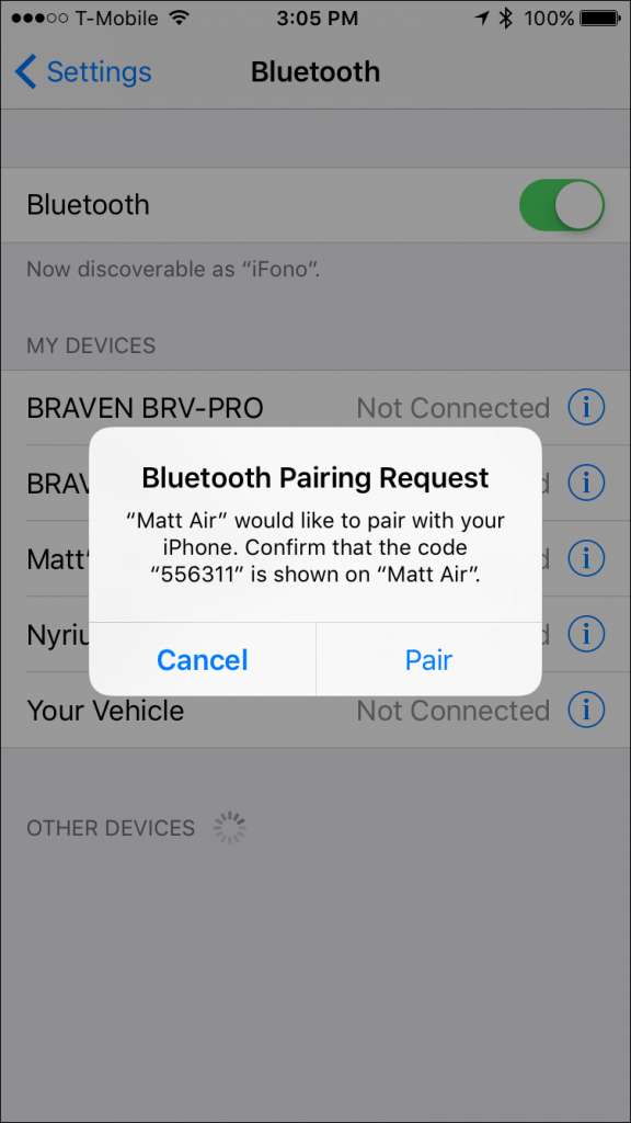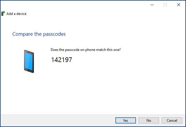 เช่นเดียวกับการเชื่อมต่อ Bluetooth อื่น ๆ คุณจะเห็นรหัสคู่บนคอมพิวเตอร์และ iPhone ของคุณ เปรียบเทียบรหัสทั้งสองรหัสและหากเหมือนกันให้แตะ“ จับคู่” บนหน้าจอ iPhone ของคุณและ“ ใช่” บนหน้าจอคู่ของ Windows