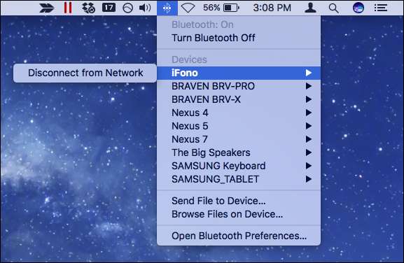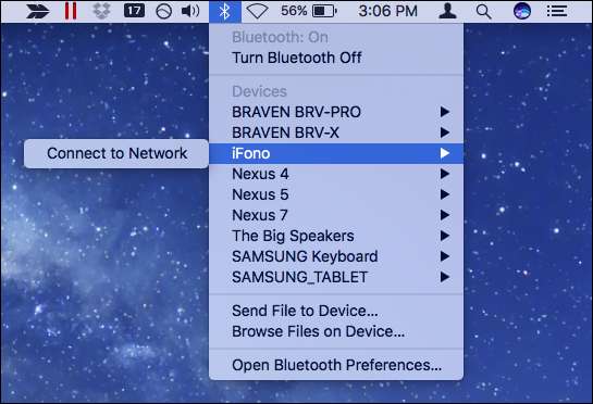 ตอนนี้จากแถบเมนูของ Mac คลิกสัญลักษณ์บลูทู ธ ไฮไลต์ iPhone ของคุณในรายการแล้วคลิก "เชื่อมต่อกับเครือข่าย"