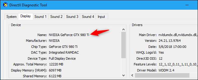 ใน Windows 7 คุณจะพบชื่อ GPU ของระบบได้ใน เครื่องมือ dxdiag . ในการเปิดให้กด Windows + R พิมพ์“ dxdiag” ในกล่องเรียกใช้จากนั้นกด Enter คลิกแท็บ "แสดง" และมองไปทางขวาของรายการ "ชื่อ" ในส่วน "อุปกรณ์"