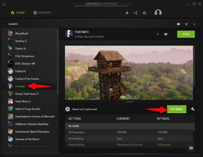 หากคุณมีฮาร์ดแวร์ NVIDIA เราขอแนะนำให้ใช้ NVIDIA GeForce Experience ซึ่งมาพร้อมกับไดรเวอร์กราฟิกของคุณ เพียงเปิดแอปพลิเคชัน GeForce Experience จากเมนูเริ่มของคุณคุณจะเห็นรายชื่อเกมที่คุณติดตั้ง เลือกเกมและคลิกปุ่ม "เพิ่มประสิทธิภาพ" เพื่อใช้การตั้งค่าที่ NVIDIA แนะนำสำหรับเกมนั้นโดยอัตโนมัติตามฮาร์ดแวร์ของระบบของคุณ