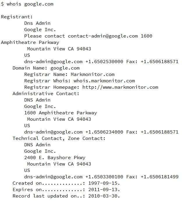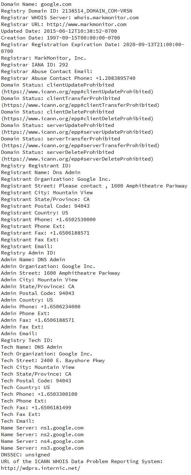 ตัวอย่างผลลัพธ์ ( ที่มา: https://whois.domaintools.com/google.com ):