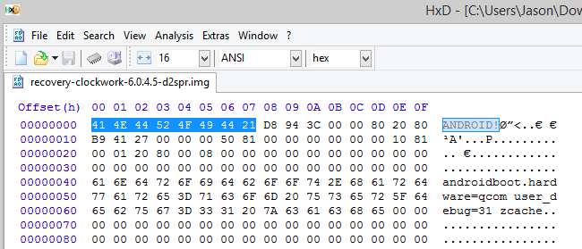 ตัวอย่างเพิ่มเติมอิมเมจการกู้คืนสำหรับโทรศัพท์ Android เช่น ClockworkMod เริ่มต้นด้วย“ ANDROID!” หากอ่านในรูปแบบ ASCII