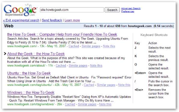 ตรวจสอบความดีงามของแป้นพิมพ์ลัด ... ใช้ J และ K สำหรับผลลัพธ์ถัดไป / ก่อนหน้า O เพื่อเปิดและ / เพื่อย้ายกลับไปที่ช่องค้นหา (เยี่ยมมากเมื่อคุณไม่พบสิ่งใดเลยในการค้นหาครั้งแรก)