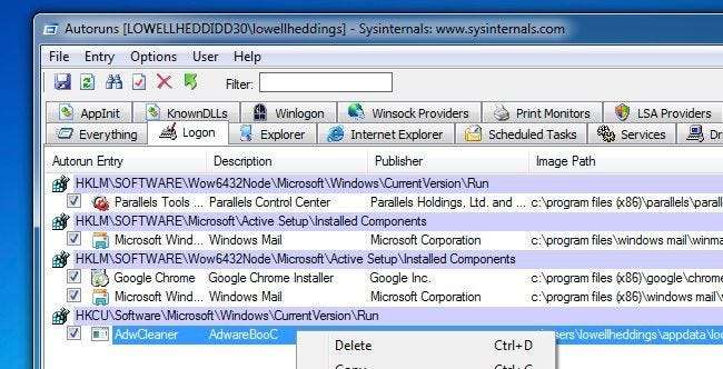 หากคุณไม่มี msconfig เนื่องจากคุณใช้ Windows 8 คุณสามารถใช้ไฟล์ ทำงานอัตโนมัติจาก SysInternals (ซึ่งเป็นส่วนหนึ่งของ Microsoft) ค้นหารายการเริ่มต้นในแท็บ Logon และลบออก