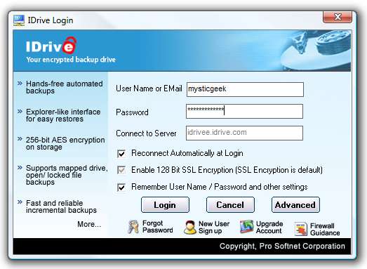 เช่นเดียวกับบริการจัดเก็บข้อมูลออนไลน์อื่น ๆ คุณต้องตั้งค่าบัญชีฟรีบนไซต์และดาวน์โหลดซอฟต์แวร์เดสก์ท็อป เมื่อคุณเปิด IDrive ครั้งแรกคุณจะได้รับแจ้งให้เข้าสู่ระบบ