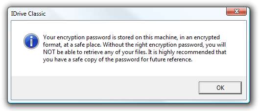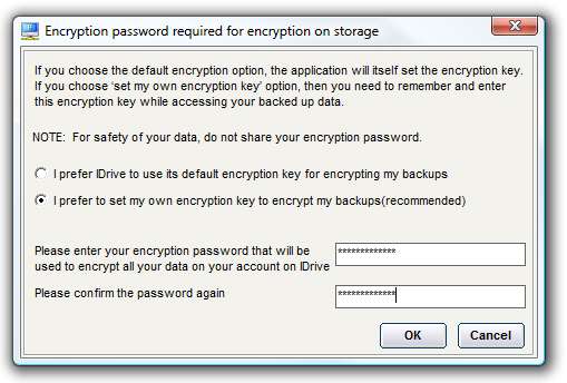 หลังจากลงชื่อเข้าใช้คุณจะได้รับหน้าต่างสำหรับตั้งค่ารหัสผ่านที่เก็บการเข้ารหัส ฉันตั้งรหัสผ่านของตัวเองตามคำแนะนำ อย่าลืมรหัสผ่านนี้เนื่องจากคุณไม่สามารถเรียกคืนได้หากทำหาย IDrive ไม่เก็บรหัสผ่านบนเซิร์ฟเวอร์ของตน หากคุณเลือกคีย์การเข้ารหัสเริ่มต้นจาก IDrive คุณจะไม่ต้องป้อนคีย์ใด ๆ