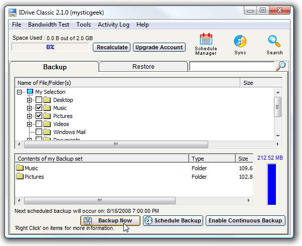 ตกลงฉันเลือกไดเรกทอรีสองสามรายการเพื่อสำรองข้อมูล คุณสามารถดูขนาดรวมของไฟล์ที่รวมกันคือ 212 MB เมื่อทุกอย่างเรียบร้อยดีให้คลิกที่ การสำรองข้อมูลในขณะนี้ .