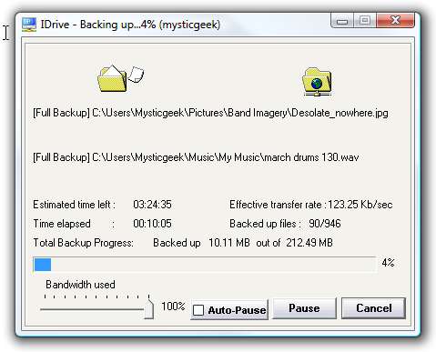 นี่คือหน้าจอระหว่างการถ่ายโอนข้อมูลที่ปลอดภัยจริง สังเกตว่าคุณสามารถปรับปริมาณแบนด์วิดท์ที่ใช้และสามารถหยุดการสำรองข้อมูลชั่วคราวได้