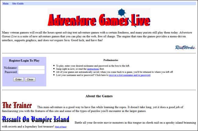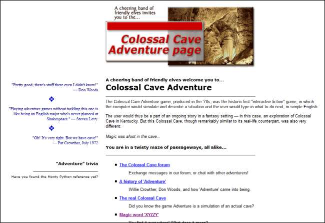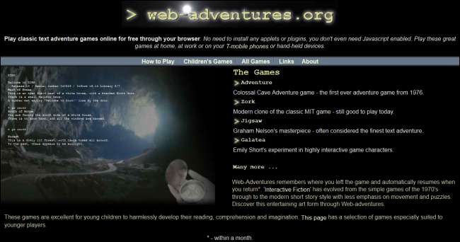 การผจญภัยบนเว็บ ให้คุณเล่นเกมผจญภัยข้อความคลาสสิกออนไลน์ได้ฟรีในเบราว์เซอร์ของคุณ คุณไม่จำเป็นต้องติดตั้งแอพเพล็ตหรือปลั๊กอินใด ๆ หรือเปิดใช้งาน JavaScript คุณยังสามารถเล่นเกมเหล่านี้บางเกมในเบราว์เซอร์บนอุปกรณ์มือถือ เกมผจญภัยตัวอักษรเกมแรกจากปลายปี 1970 Colossal Cave Adventure มีให้บริการบนไซต์นี้
