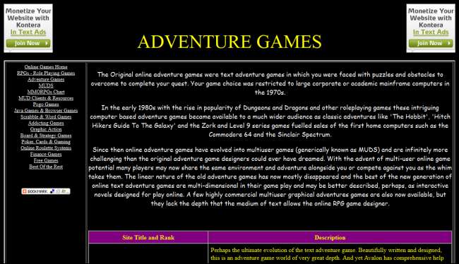 หน้าเกมผจญภัยในไซต์ Online Games Network มีคอลเล็กชันลิงก์ไปยังไซต์ที่นำเสนอการผจญภัยแบบข้อความคลาสสิกและแบบใหม่และเกมสวมบทบาท