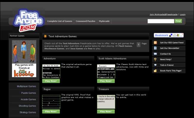 FreeArcade.com นำเสนอเกมผจญภัยแบบข้อความหลายเกมรวมถึงการผจญภัยแบบข้อความคลาสสิกของ Scott Adams เช่น Adventureland ซึ่งตอนนี้มีคำแนะนำและวิธีแก้ปัญหา Adventureland เป็นโปรแกรมแรกของ Adams และเป็นเวอร์ชันคอมพิวเตอร์ส่วนบุคคลของโปรแกรม Colossal Cave Adventure ดั้งเดิมที่มีการปรับขนาดลงเล็กน้อยซึ่งเดิมเขียนขึ้นสำหรับคอมพิวเตอร์เมนเฟรม