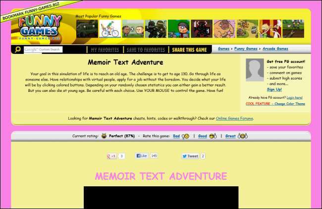 Funny-Games.biz นำเสนอเกมผจญภัยแบบข้อความชื่อ การผจญภัยข้อความ Memoir ซึ่งเป็นการจำลองชีวิต เป้าหมายของเกมคืออายุ 130 ในระหว่างเกมคุณมีความสัมพันธ์กับคนเสมือนจริงสมัครงานเจ๋ง ๆ ฯลฯ ตัดสินใจเกี่ยวกับทิศทางชีวิตเสมือนจริงของคุณโดยคลิกปุ่มสีด้วยเมาส์