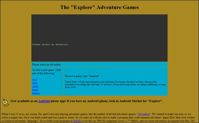 เกมผจญภัย“ สำรวจ” ไซต์มีชุดเกมผจญภัยแบบข้อความที่คุณสามารถเล่นออนไลน์ได้ เมื่อคุณเริ่มเกม“ สำรวจ” คุณต้องเลือกการผจญภัย Cave, Mine และ Castle เป็นเกมต้นฉบับที่เขียนใน "Explore Adventure Language" โดยบุคคลที่ดำเนินการไซต์นี้ Haunt เป็นโคลนของเกม Haunted House ที่เขียนขึ้นสำหรับ TRS-80 ซึ่งกล่าวถึงก่อนหน้านี้ในบทความนี้ Porky’s เป็นเกมที่เขียนโดยคนอื่นโดยใช้“ Explore Adventure Language” เดียวกัน ได้รับแรงบันดาลใจจากภาพยนตร์ชื่อเดียวกันและมีเนื้อหาสำหรับผู้ใหญ่และภาษา