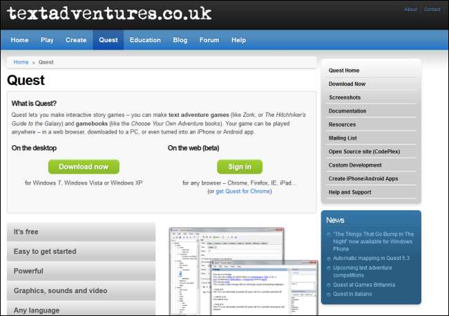 เควส เป็นโปรแกรมโอเพ่นซอร์สฟรีที่ให้คุณสร้างเกมผจญภัยแบบข้อความเช่น Zork หรือ The Hitchhiker’s Guide to the Galaxy โดยที่ไม่มีความรู้เรื่องการเขียนโปรแกรม คุณยังสามารถสร้างหนังสือเกม (เช่นเลือกหนังสือผจญภัยของคุณเอง) เกมที่สร้างด้วย Quest สามารถเล่นได้ในเว็บเบราว์เซอร์ดาวน์โหลดลงพีซีของคุณหรือแม้กระทั่งเปลี่ยนเป็นแอป iPhone หรือ Android คุณสามารถดาวน์โหลด Quest ได้ฟรีและติดตั้งบนพีซีของคุณหรือใช้งานได้ฟรีในเว็บเบราว์เซอร์ของคุณ