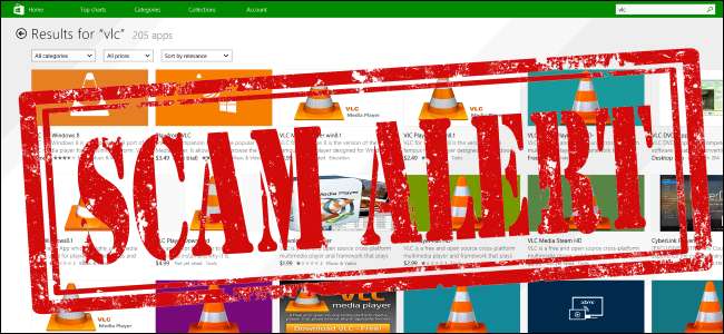 ปัญหานี้ไม่ใช่ความลับ ค้นหาไฟล์ Windows Store สำหรับแอปยอดนิยมและคุณจะเห็นขยะทุกประเภท ตัวอย่างเช่นนี่คือสิ่งที่เกิดขึ้นเมื่อเราค้นหา VLC ใน Windows Store: