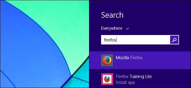 ที่แย่ไปกว่านั้น Windows Store ได้รวมเข้ากับคุณลักษณะการค้นหาระบบแล้ว ค้นหาแอปพลิเคชัน โดยใช้การค้นหาหน้าจอเริ่มหรือทางลัดการค้นหาและแอปขยะเหล่านี้จาก Windows Store จะปรากฏขึ้น ตัวอย่างเช่นเมื่อใดก็ตามที่ฉันใช้คุณลักษณะการค้นหาระบบเพื่อเปิด Firefox ฉันจะเห็นลิงก์สำหรับติดตั้ง“ Firefox Training Lite” จาก Windows Store